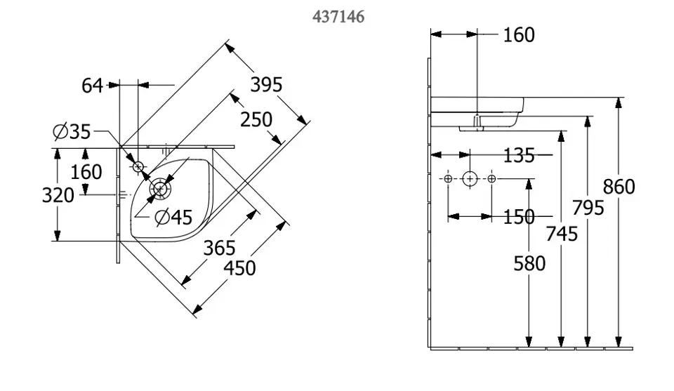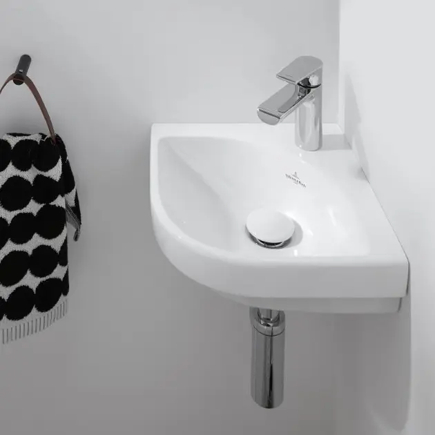 Hörntvättställ med kvartsrund form
